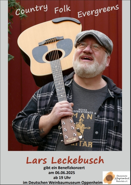 Am 6. Juni 2025 um 19 Uhr erwartet euch ein ganz besonderes Event im Deutschen Weinbaumuseum: Ein Benefizkonzert mit Lars Leckebusch, der euch mit seinen wundervollen Klängen aus Country, Folk und Evergreens verzaubern wird.
