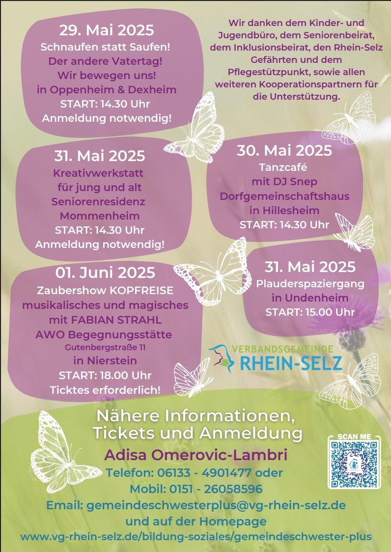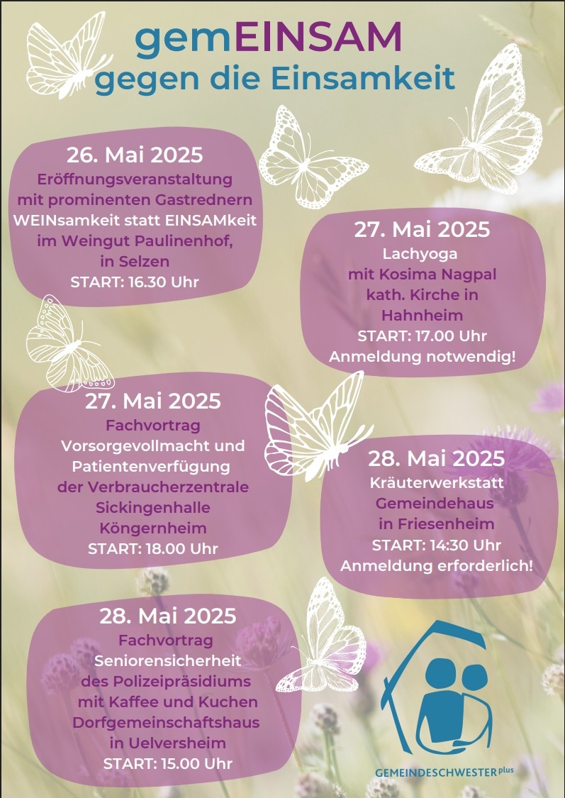 Gemeinsam stark gegen Einsamkeit – das ist das Ziel der VG Rhein-Selz! Mit voller Energie und einem klaren Zeichen gegen soziale Isolation beteiligt sich die VG an der bundesweiten Aktionswoche „gemEINSAM gegen die Einsamkeit", organisiert vom Bundesministerium für Familie, Senioren, Frauen und Jugend. Vom 26. Mai bis zum 1. Juni erwarten uns spannende Veranstaltungen, die Menschen zusammenbringen und Gemeinschaft fördern.