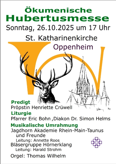 In Oppenheim findet am Sonntag, den 26. Oktober 2025 um 17:00 Uhr in der St. Katharinenkirche eine ökumenische Hubertusmesse statt.